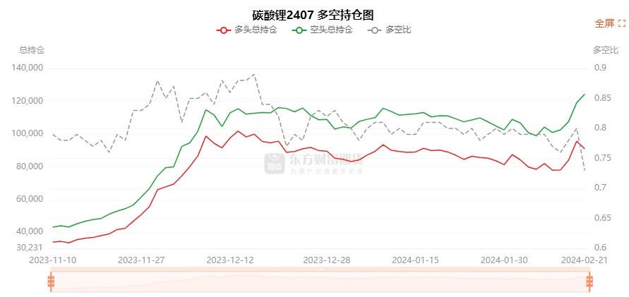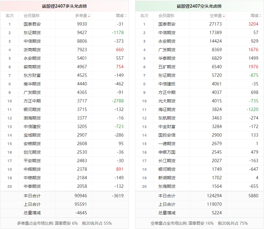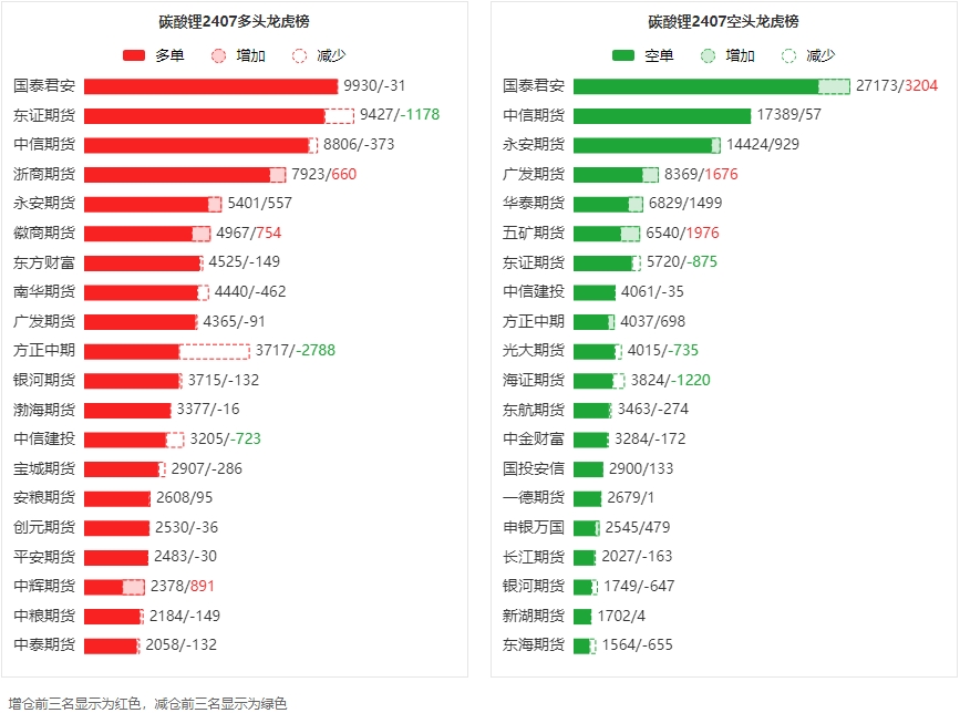 总体而言,碳酸锂2407合约今日减仓上行,多空持仓排名前20席中,多方呈退场态势,空方呈进场态势。